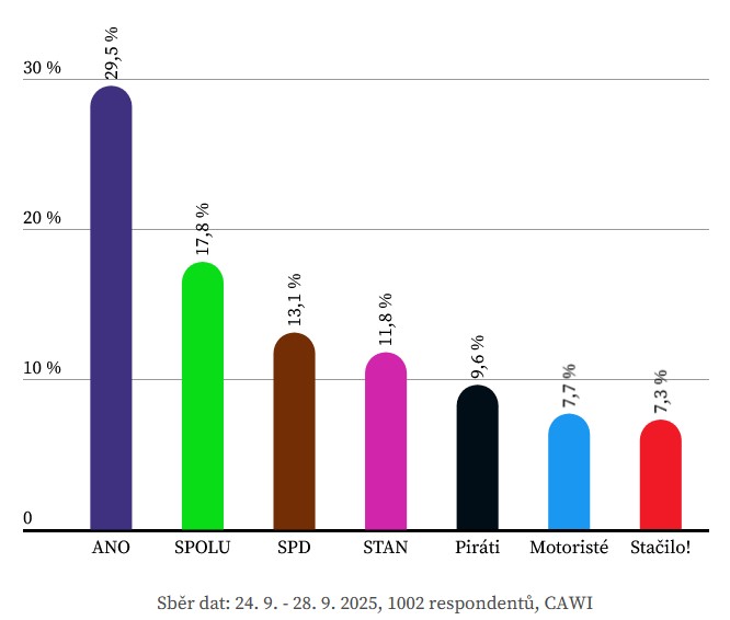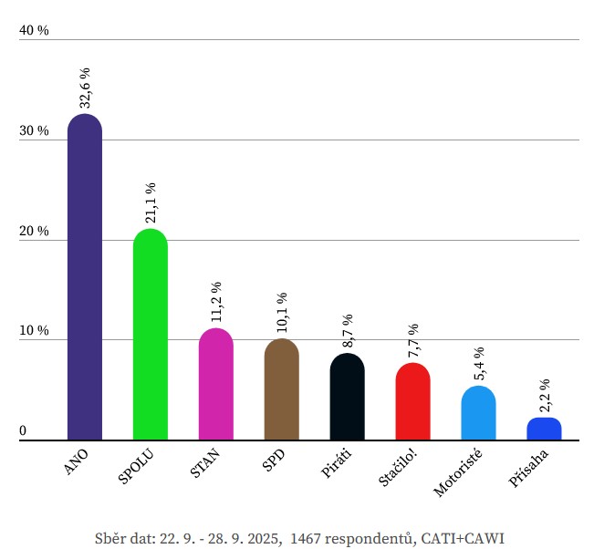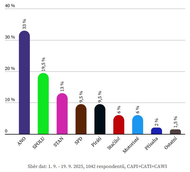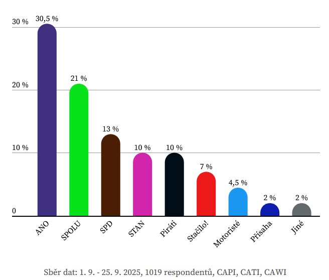 Poslední průzkum agentury IPSOS přináší podobná čísla jako ten předchozí, hnutí ANO má i nadále vysoký, více než 11% náskok před koalicí SPOLU. Na bronzovou pozici se dostalo hnutí STAN, které si vyměnilo pozici s SPD.
